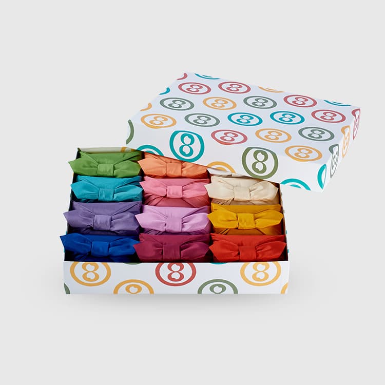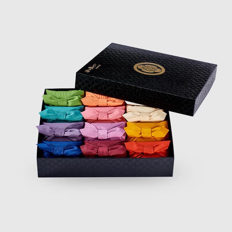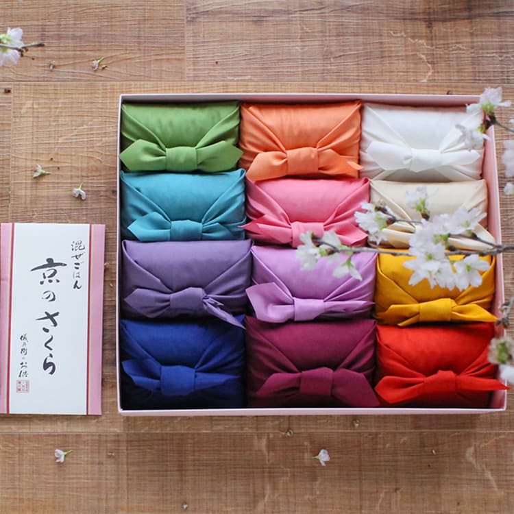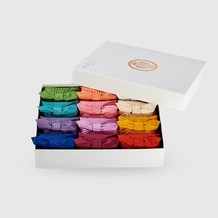 十二色の風呂敷包みは、「十二単」になぞらえたもの。感謝の気持ちや様々な願い、そして春の喜びなどたくさんの想いをこめた、特別な彩りです。